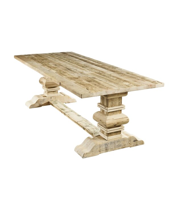 Dieser robuste Delft-Esstisch aus Holz hat ein schönes Design mit einem dezenten Holzsockel. Wie abgebildet ist der Holz-Esstisch aus massiver, robuster und bewohnter Alteiche gefertigt. Die Eichenplatte hat eine konische Kante und abgerundete Ecken, diese Formen passen gut zum Holzsockel.