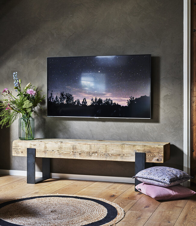 Dieser robuste TV-Ständer ist aus massiven, wiederverwerteten Balken gefertigt. Durch die Patina der Balken besitzt der Ständer einen rustikalen und einzigartigen Charakter. Die Kombination aus Holz und Stahl verleiht ihm einen industriellen Look.