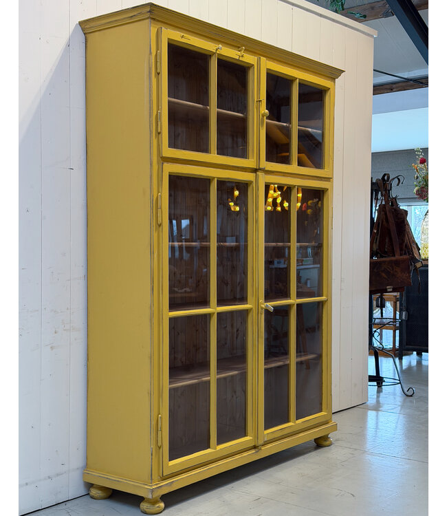 Der gelbe Vintage-Vitrinenschrank ist aus Holz gefertigt und hat vier Türen mit Antikglas. Er kann beispielsweise als Vitrinenschrank oder Bücherregal verwendet werden.