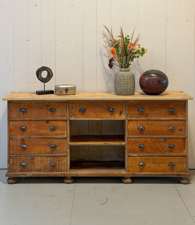 Die Kommode besteht aus einem Vintage-Holzschrank. Durch die Wiederverwendung alter Materialien ist diese Kommode absolut nachhaltig. Die Kommode/Wandschrank verfügt über 9 große Schubladen. Der Holzschrank kann im Wohnzimmer, Schlafzimmer und in der Küche verwendet werden