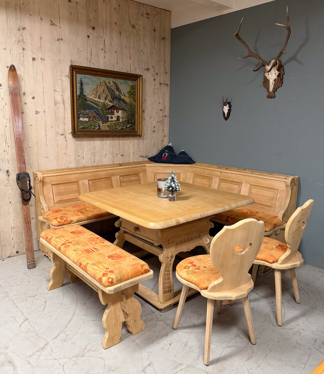 This unique Stube set brings the warmth of the Alps to any room. Perfect as a chalet dining area , a cozy restaurant seating area , or a cozy nook in the kitchen or veranda . Its sturdy construction and comfortable seating make it the perfect spot for long evenings of dining and drinks.