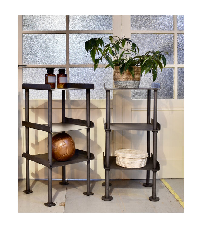 Sturdy industrial tiered stand. The bare metal tiered stand is treated with oil.