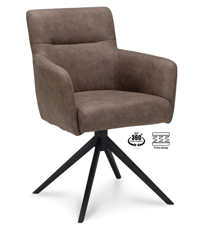 The black metal swivel base with a 360° return function ensures the chair automatically returns to its original position, keeping your dining area neat and tidy.