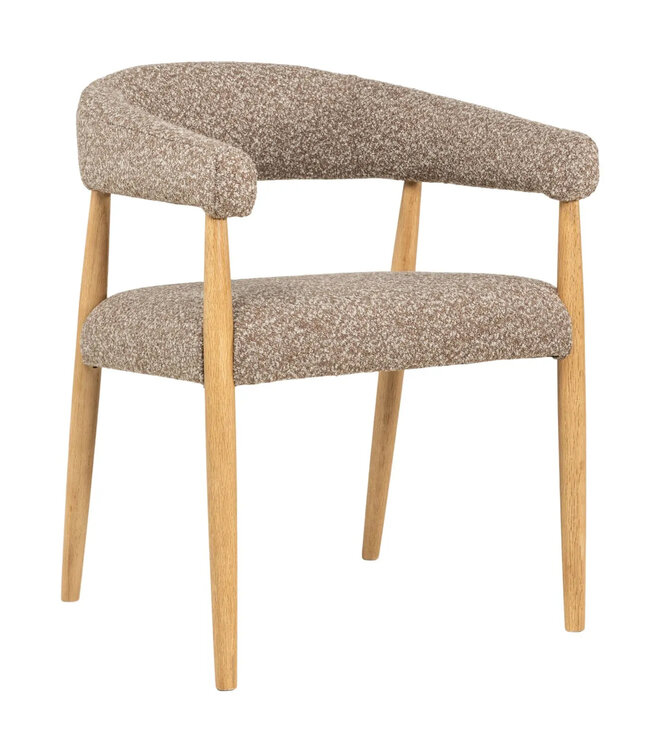 Stoel Noor met een bruine stof is een moderne eetkamerstoel met een zachte, uitnodigende uitstraling. Dankzij de ronde rugleuning en armleuningen zit deze stoel niet alleen comfortabel, maar geeft hij ook direct sfeer aan je interieur.